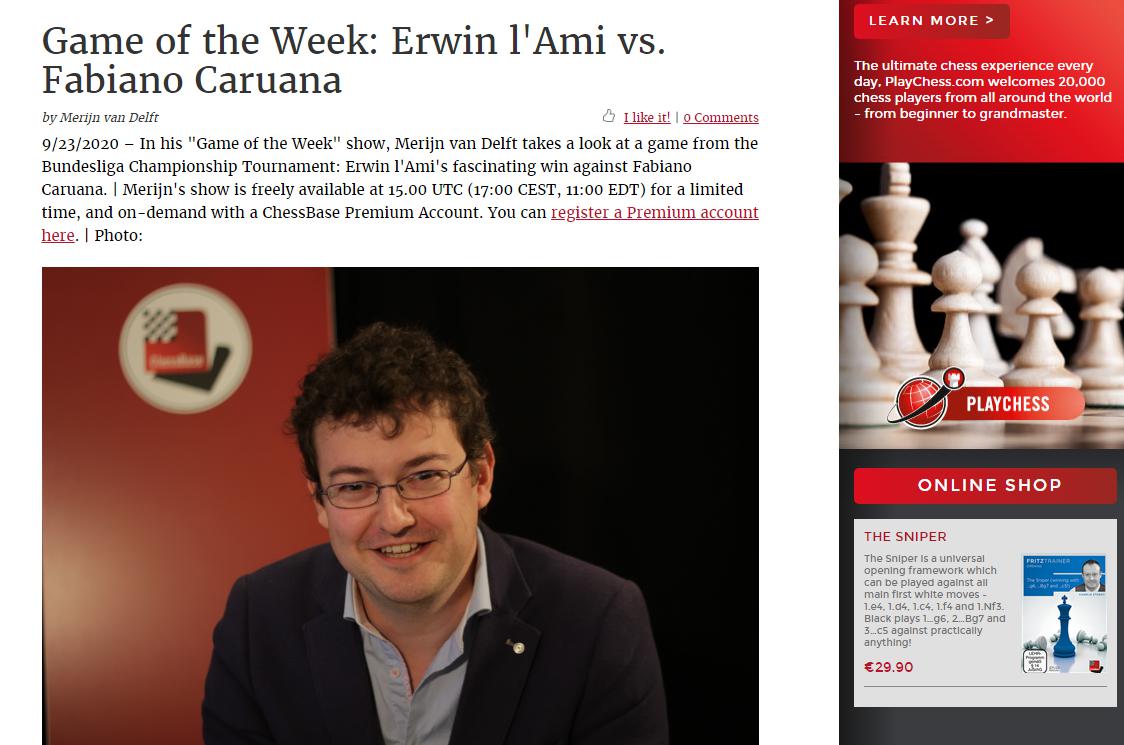 Fabiano Caruana. Posted 2020-09-23, Chessbase. In his. "Game of the Week". show, Merijn van Delft takes a look at a game from the Bundesliga ...